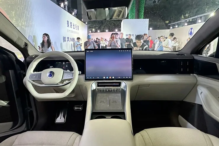 У салоні BYD Denza N8L на передній панелі встановлено три екрани. Сімейний кросовер пропонують у шестимісному виконанні, причому крісла другого ряду отримали електропривід, а сидіння третього ряду мають горизонтальне регулювання та змінний кут нахилу спинки.
