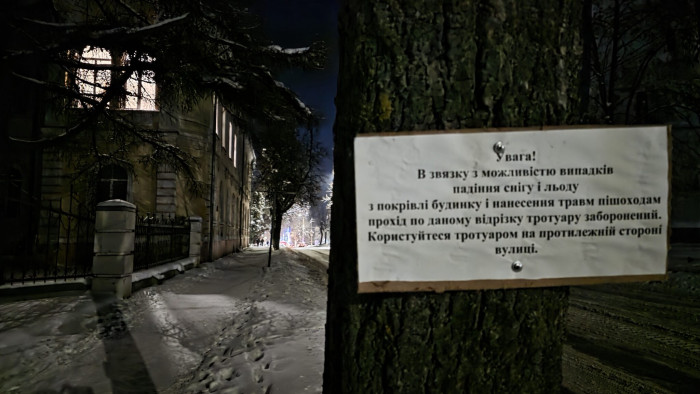 «У зв’язку з можливістю випадків падіння снігу і льоду з покрівлі будинку і нанесення травм пішоходам, прохід по даному відрізку тротуару заборонений».
