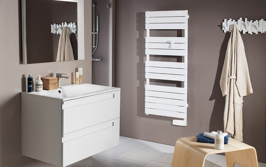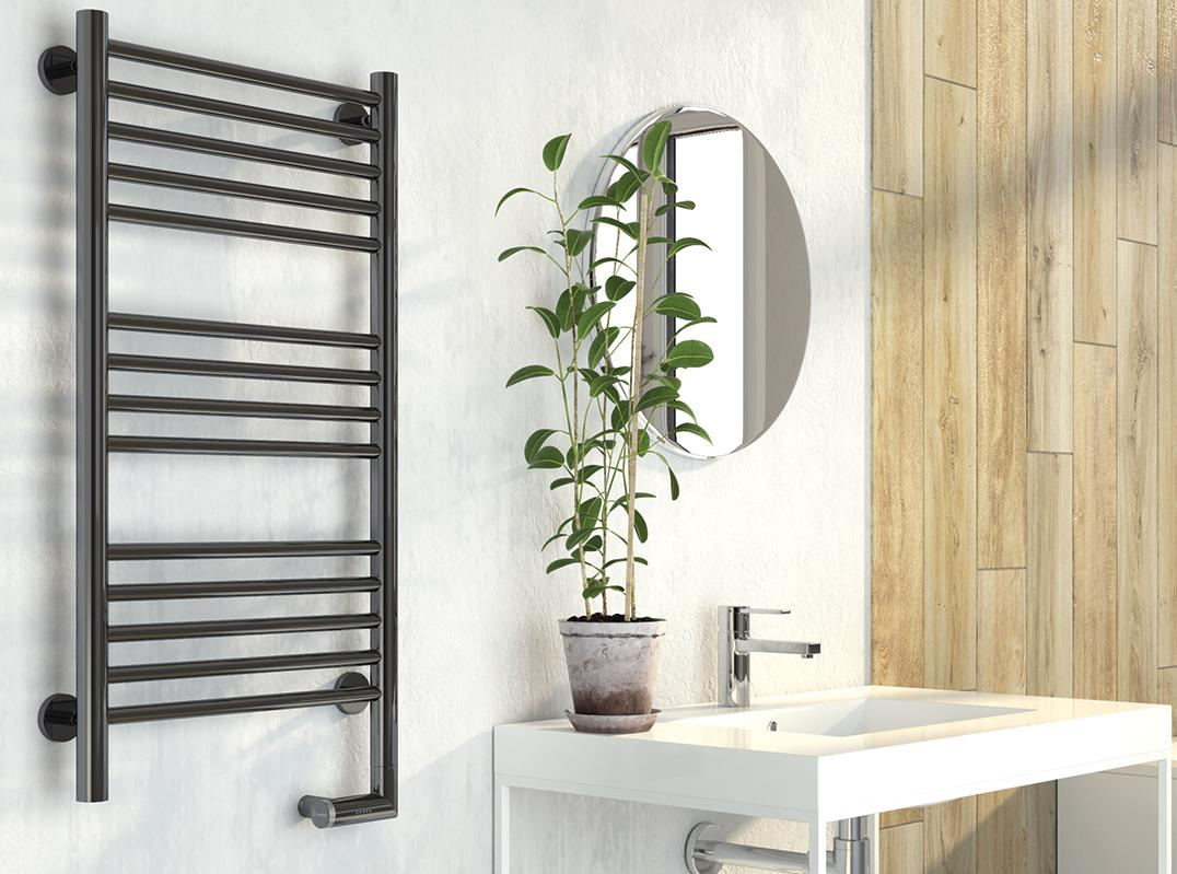 На этапе черновых работ стоит определить место установки полотенцесушителя и вывести электрический кабель. Не нужно устанавливать розетку, ведь большинство электрических лесенок имеют разъем для скрытого подключения. Они лучше смотрятся в интерьере, а для включения или регулировки интенсивности нагрева имеют панель управления. Мы советуем устанавливать только электрические полотенцесушители, ведь они не протекают и не зависят от наличия отопления или горячей воды.