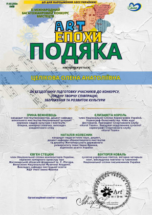 Організаційний комітет конкурсу відзначив роботу педагога окремою подякою за підготовку учасників та сприяння розвитку культури.