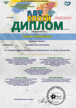 Вихованка Глухівської школи мистецтв імені М. Березовського Уляна Тимошенко стала лауреатом першої премії на другому Міжнародному багатожанровому конкурсі мистецтв «Art епохи».