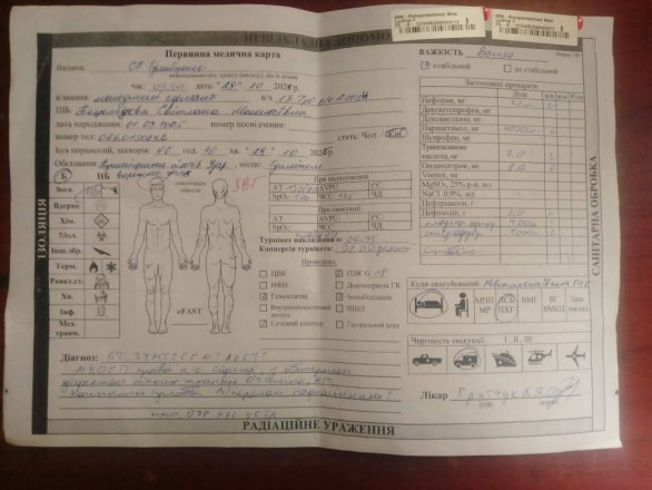 Згідно з первинною медичною картою, поранення Світлани класифікується як вибухова травма (ВТ), закрита черепно-мозкова травма, забій головного мозку, уламкове поранення лівого стегна. Стан – важкий, дівчина перенесла шок ІІІ ступеня. Наразі вона проходить складне лікування, попереду – тривалий шлях реабілітації.