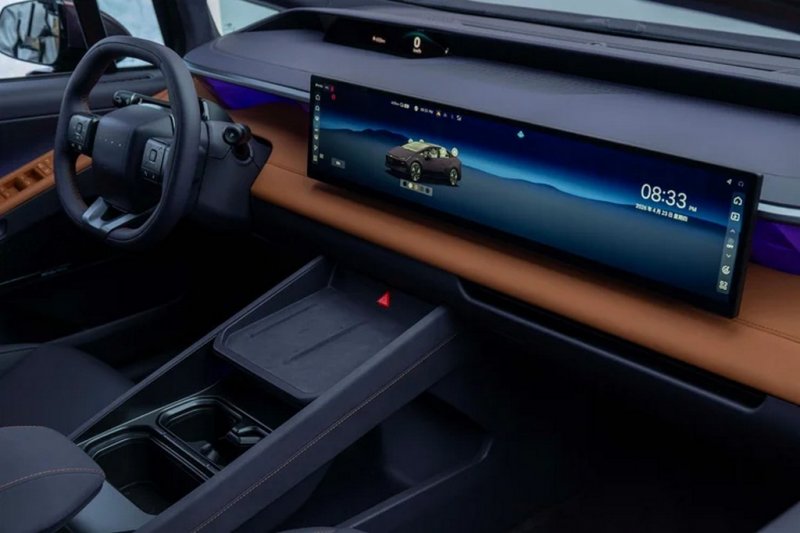Також встановили величезнй 27-дюймовий тачскрін і проєкцію на лобове скло, а от кнопок усередині майже немає. Передні крісла розділені високою дворівневою консоллю.