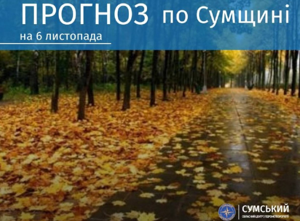6 листопада: хмарно з проясненнями, вночі невеликий дощ, вдень без істотних опадів. Вітер південний, 9-14 м/с. Температура повітря по області вночі +8°..+13°, вдень +10..+15°, по м.Суми вночі +9°..+11°, вдень +12°..+14°.