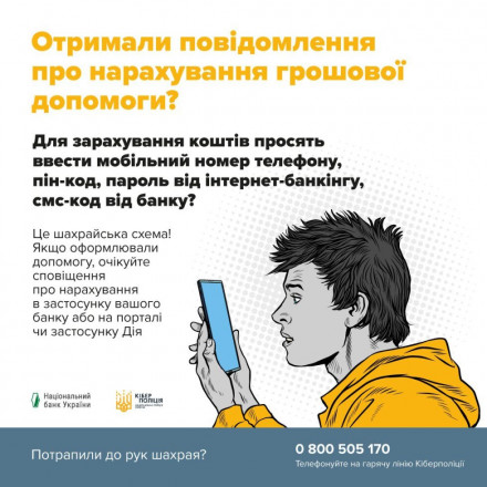 Поліція застерігає: якщо ви раптом отримали повідомлення про нарахування фінансової допомоги, але для отримання грошових коштів вас просять назвати особисті дані та реквізити банківських карток — негайно перервіть спілкування, адже ви маєте справу з шахраями.
