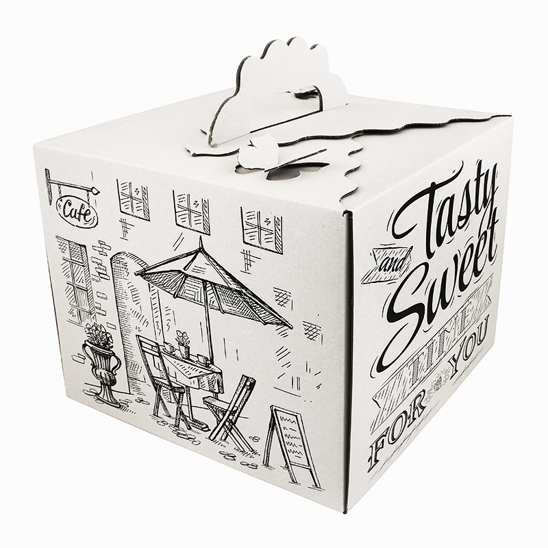 - Упаковка для торта из картона выглядит значительно презентабельнее, чем пластиковая. Из этого материала удобно создавать не только квадратные, прямоугольные и круглые изделия, но и популярные сейчас бонбоньерки.