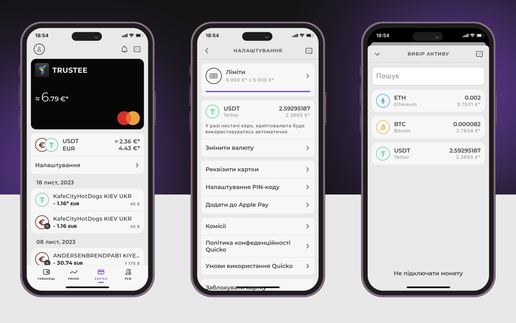 Криптокарта Trustee Plus выпускается и привязывается к одной из трех основных криптовалют: BTC, ETH или USDT, что позволяет избежать процедур обмена. Просто выберите нужную валюту, и средства с вашего кошелька будут автоматически списаны при каждой транзакции.