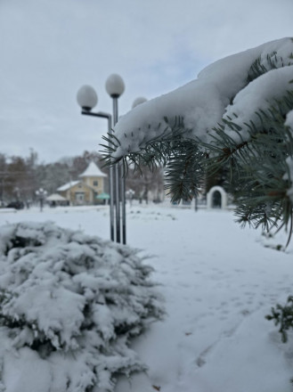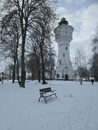 Сніг підкреслив кожен ярус і водонапірної вежі, зробивши її ще помітнішою на фоні сірого неба. Парк навколо башти перетворився на лабіринт: дерева схилилися під вагою пухкого вантажу, створюючи живі арки над доріжками. Лавки, засипані по самі спинки, натякають: прогулянки сьогодні мають бути активними, бо присісти відпочити вийде хіба що в замет.