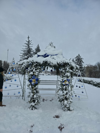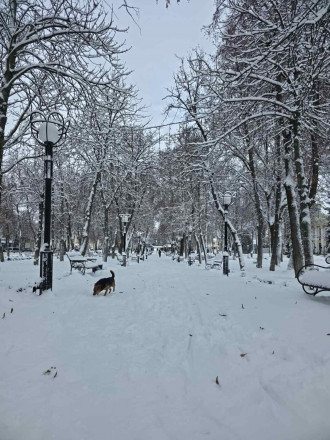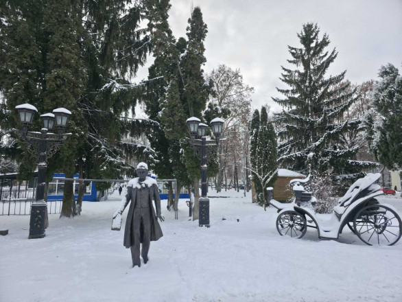 У центрі подій – Тарас Григорович. Снігопад вніс свої корективи в образ Кобзаря, накинувши на плечі білу «кирею». Поет зустрічає негоду зосереджено та стримано, не зважаючи на вітер і замети. Поруч «припаркована» карета, яка за ніч змінила колір на радикально білий. Тепер це не просто фотозона, а справжній крижаний екіпаж, що ніби чекає на коней, аби рушити засніженими вулицями.