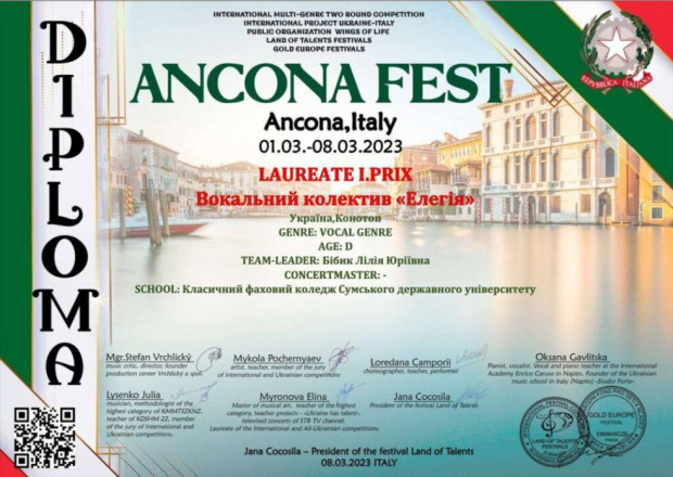 Вокалісти КФК СумДУ колективу «Елегія» (керівниця Лілія Бібик) одержали перемогу у Міжнародному Благодійному конкурсі мистецтв Україна-Італія “Ancona Fest”.