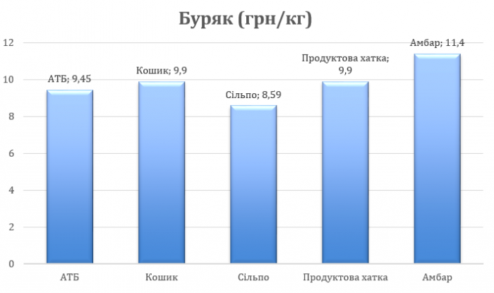 Буряк – один з найголовніших інгредієнтів улюбленої страви українців – борща. Що ж ми маємо по цінам? Перш за все, слід відзначити, що як виявилось, не усюди ви зможете його придбати. На діаграмі позначені торгові представники, у яких нам вдалося знайти цей овоч. Як можете побачити, буряк майже усюди однієї ціни, окрім «Сільпо», де він досить дешевий, усього за 8,59 гривень за кілограм. У той час, коли в магазині «Амбар» придбати його зможете за 11,40 гривень.