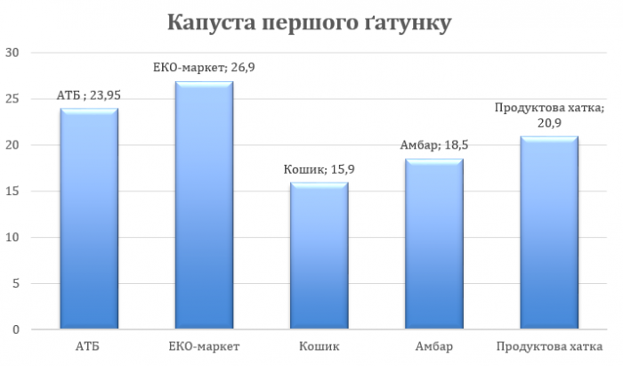 Як ви можете помітити, у торговій мережі «Сільпо» ми не змогли знайти капусту білокачанну. Проте, спираючись на подані данні, можемо сказати, що найдешевшу капусту ви зможете придбати у магазині «Кошик» — 15,90 гривень за кілограм. У той же час, найдорожче – у мережі «ЕКО-маркет» за кілограм ви віддасте 26,90 гривень. З нейтральними цінами ознайомитись зможете в мережах «Амбар» (18,50 грн за кг), «АТБ» (23,95 грн за кг), «Продуктова хатка» (20,90 грн за кг).
