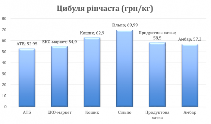 За нашими спостереженнями, можемо зробити висновок, що цибулю ви зможете придбати будь-де, тобто цей продукт має більше попиту, чим той самий буряк, який в одній торговій мережі ми не знайшли. Найдорожчий кілограм цибулі буде у «Сільпо» — аж 69,99 гривень. Найдешевший зможете придбати в «АТБ» — 52,95 гривень. За середніми цінами звертайтеся до «Продуктова хатка» (58,50 грн за кг), «Кошик» (62,90 грн за кг), «ЕКО-маркет» (54,90 грн за кг), «Амбар» (57,20 грн за кг).