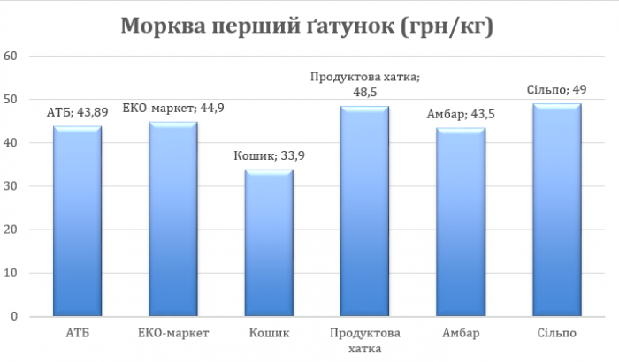 На превеликий жаль, ми не змогли знайти моркву у «Сільпо» в офлайн-режимі. Можливо, просто не встигли викласти, бо на офіційному сайті вона є за ціною 4,90 гривень за 100г. За кілограм ви віддасте 49 гривень, що робить її найдорожчою серед торгових мереж. Найменше ви заплатите у магазині «Кошик». Там за кілограм ціна буде – 33,90 гривень. А з середніми цінами «АТБ» (43,89 грн за кг), «Продуктова хатка» (48,50 грн за кг), «Амбар» (43,50 грн за кг), «ЕКО-маркет» (44, 90 грн за кг).
