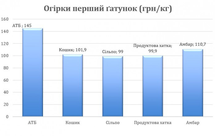 За поданою діаграмою, можемо помітити, що ціни на огірки більш-менш усюди однакові: варіюються у межах 100-110 гривень за кілограм. Тим не менш, найменшою ціною на огірки першого ґатунку відзначилось «Сільпо» — 99 гривень за кілограм. «АТБ», у свою чергу, зробило найменшу вартість, але за 100 г, тобто якщо порахувати, то можна зрозуміти, що у цій торговій мережі, за кілограм ви віддасте аж 145 гривень. Цей показник б’є усі рекорди по цінам. З середніми цінами такі торгові марки як «Продуктова хатка» (99,90 грн за кг), «Кошик» (101,90 грн за кг), «Амбар» (110,70 грн за кг).