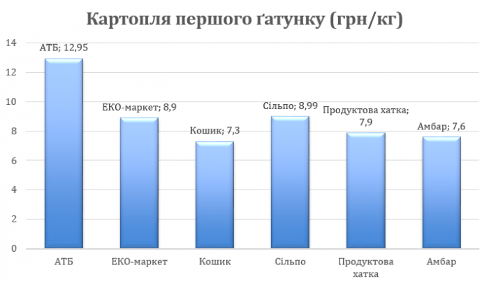 Провівши дослідження, ми виявили, що найнижча ціна на картоплю у торговій мережі магазинів «Кошик», де ціна за кілограм – 7,30 гривень. Найдорожчий показник спостерігаємо в «АТБ» — аж 12,95 гривень за кілограм. Середніми показниками відзначилися мережі «Сільпо» (8,99 грн за кг), «ЕКО-маркет» (8,90 грн за кг), «Продуктова хатка» (7,90 грн за кг), «Амбар» (7,60 грн за кг).