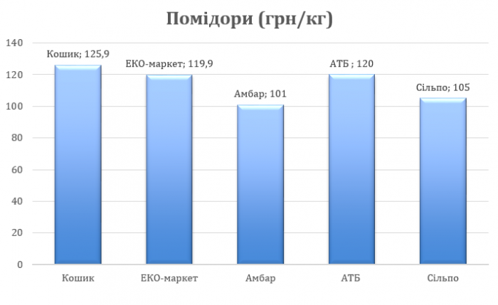 Ціни на помідори усюди досить різні. І через це, ви повинні досить уважно подивитися на діаграму та визначити для себе, куди ви точно не підете купляти їх. Найменше за кілограм помідорів ви віддасте в магазині «Амбар» — 101 гривня. Найбільше – це 125,90 гривень за кілограм у «Кошик». З більш-менш цінами у «Сільпо» (105 гривень за кг), «ЕКО-маркет» (119,90 грн за кг), «АТБ» (12 грн за 100г).