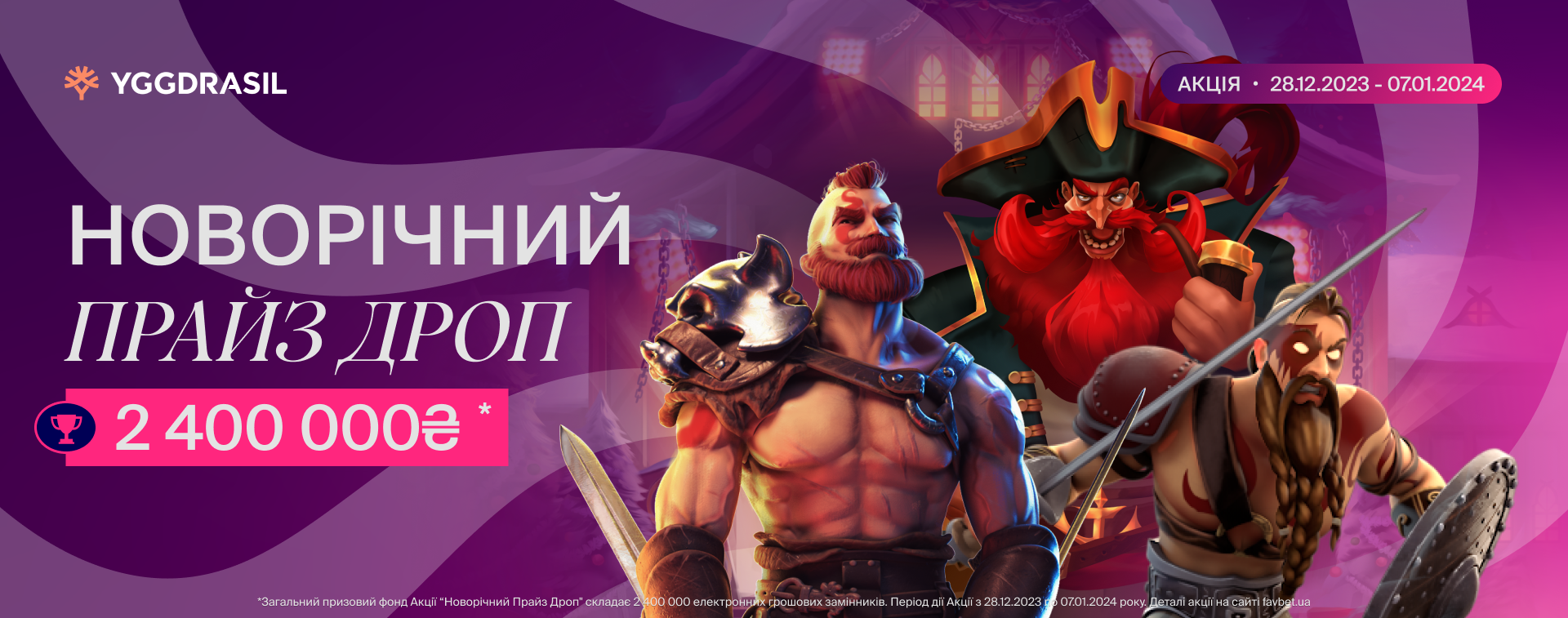 Ще один розіграш у форматі прайз дроп, але тепер вже для шанувальників live-ігор, тобто ігор з реальними круп’є. «Святковий прайз дроп» проходить з 23 грудня 2023 року до 3 січня 2024 року та має загальний призовий фонд 200 000₴.