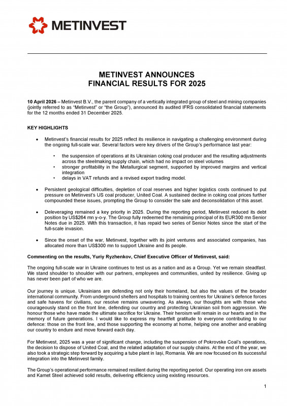 Станом на кінець року «Метінвест» мав близько $375 млн грошових коштів, а загальний обсяг єврооблігацій становив $1,26 млрд. Компанія веде переговори щодо їх рефінансування та планує виконати зобов’язання за випусками.