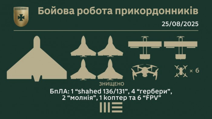 За минулу добу прикордонники на Сумщині ліквідували 14 ворожих безпілотників: 1 «шахед», 4 «гербери», 2 «молнії», 1 коптер та 6 FPV-дронів.