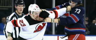 В НХЛ влаштували масову бійку вже на 1 секунді гри Фото: Getty Images Хокеїсти Девілс і Рейнджерс побилися вже після стартового спистка Хокеїсти Нью-Йорк Новости хоккея