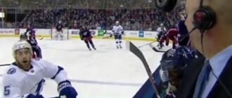 Під час матчу НХЛ шайба ледь не потрапила коментатору в голову Фото: кадр із відео Шайба пролетіла в сантиметрах від голови коментатора матчу НХЛ Епізод, Новости хоккея