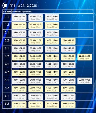 Завтра, 27 грудня, у Сумській області діятимуть графіки погодинних відключень відповідно до обсягів, доведених командою з НЕК “Укренерго”.
