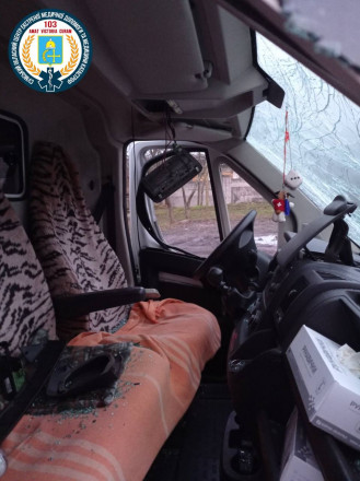 Внаслідок вибуху автомобіль отримав серйозні пошкодження, а троє медиків опинилися в епіцентрі удару.