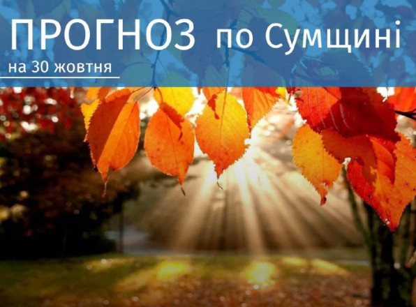 30 жовтня: мінлива хмарність, без опадів, вночі та вранці слабкий туман. Вітер вночі змінних напрямків, 3-8 м/с, вдень південно-західний, 7-12 м/с. Температура повітря по області вночі +1°..+6°, вдень +12..+17°, по м.Суми вночі +1°..+3°, вдень +14°..+16°.