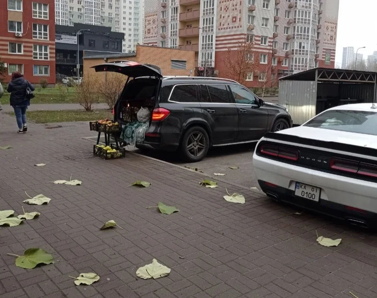 Яблука з Mercedes GLS продають серед багатоповерхівок. У багажнику кросовера запаковані ящики з фруктами, а частину з них розклали просто на тротуарі. Звертає на себе увагу і вінтажне покривало радянських часів.