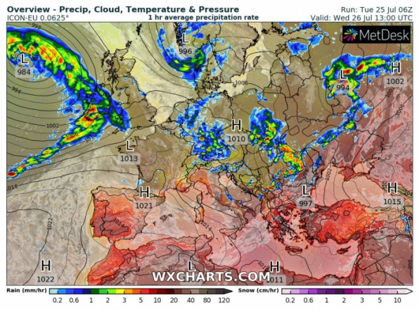 26 липня: мінлива хмарність, вночі без істотних опадів, вдень короткочасний дощ, гроза, місцями град. Вітер південний, 7-12 м/с, вдень під час грози місцями шквали 15-20 м/с. Температура повітря вночі +16..+21°, вдень +28..+33°, по м.Суми вночі +18..+20°, вдень +29..+31°.