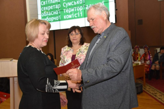 Секретар Сумської обласної територіальної виборчої комісії Світлана Положій зачитала Постанову обласної територіальної виборчої комісії, а голова Сумської обласної ради Віктор Федорченко вручив Лідії Макаровець посвідчення депутата обласної ради.