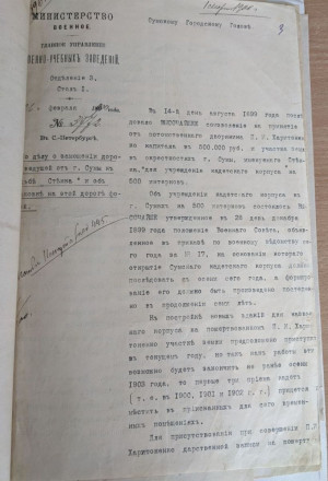 Сумський кадетський корпус було збудовано на початку XX століття за останньою волею Івана Герасимовича Харитоненка, який заповів побудувати в Сумах кадетський корпус на його дачі Лихвинська Стінка з капіталом в 500 тисяч рублів.