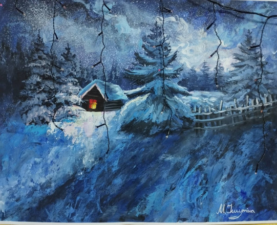 Картини Марії – це цілі міні-сюжети, де оживають засніжені хатинки з теплом у вікнах, сріблясті ліси, місячні пейзажі з ліхтарями та затишні натюрморти з кавою біля морозного скла. Зимові полотна художниці ніби запрошують глядачів на прогулянку різними куточками пори року, даруючи відчуття тиші, спокою та трішки казки.